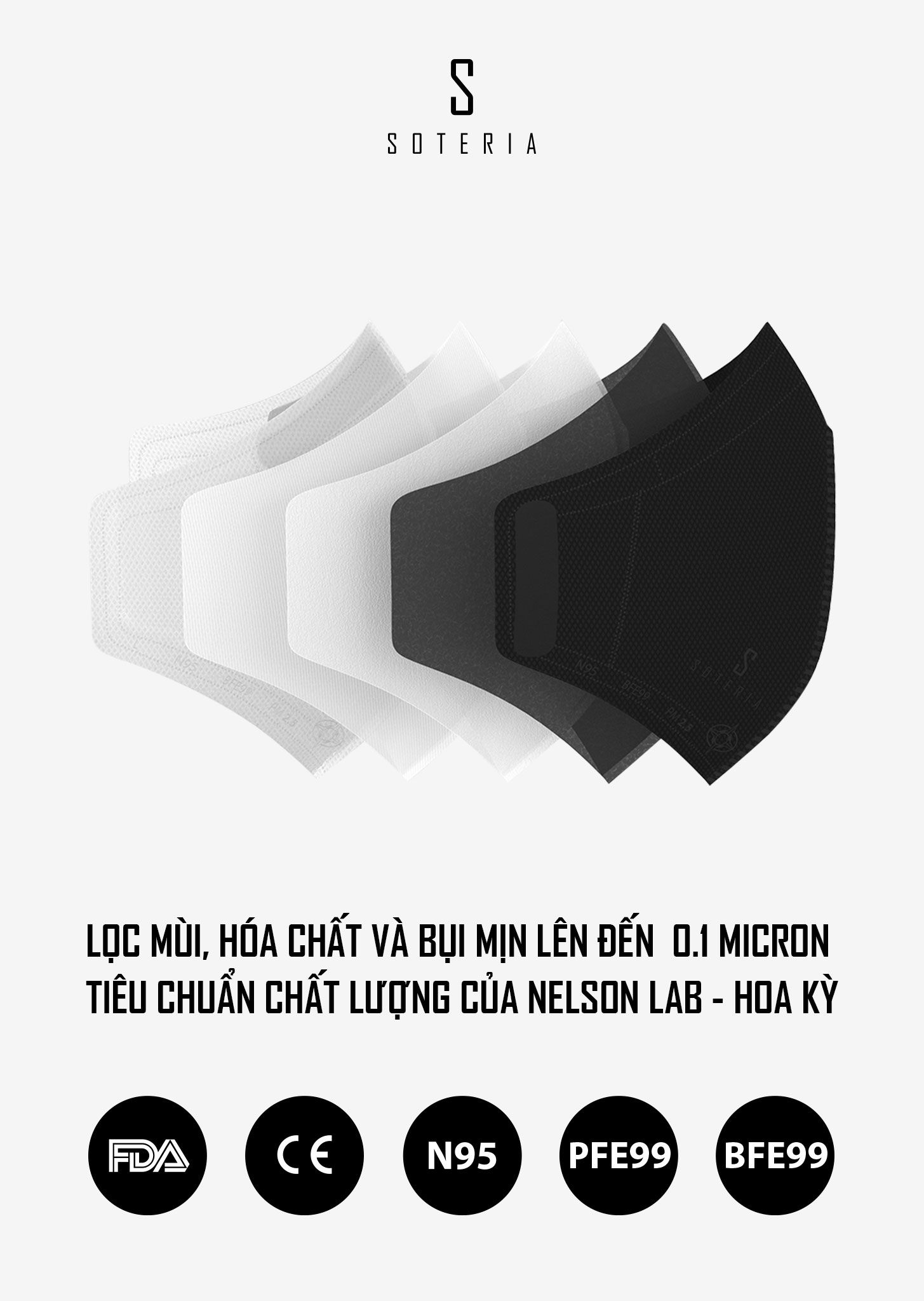 Bộ lọc 5 lớp, đạt chuẩn Mỹ N95, BFE99, PFE99- lọc 99% bụi mịn 0.1 micromet, vi khuẩn, mùi hôi, khí độc... được chứng nhận bởi Nelson Labs Hoa Kỳ, sản xuất chuẩn FDA & CE