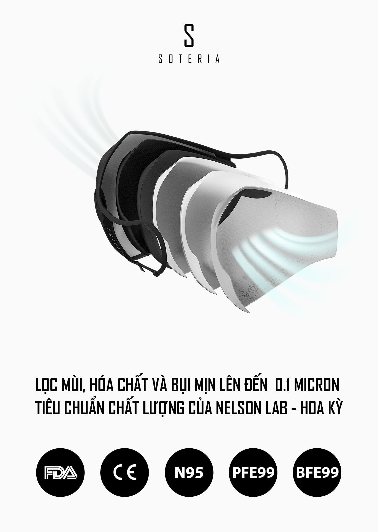 Bộ lọc 5 lớp, đạt chuẩn Mỹ N95, BFE99, PFE99- lọc 99% bụi mịn 0.1 micromet, vi khuẩn, mùi hôi, khí độc... được chứng nhận bởi Nelson Labs Hoa Kỳ, sản xuất chuẩn FDA & CE